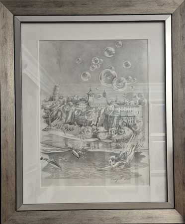 Niepowtarzalny, rysowany na papierze obraz, w magiczny surrealistyczny sposób przedstawia miasto Grudziądz.