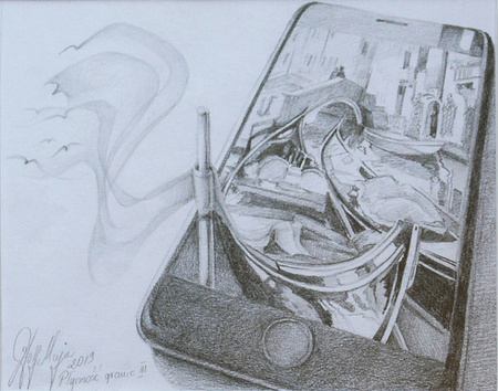 Niepowtarzalny, rysowany na papierze obraz, w magiczny surrealistyczny sposób przedstawia czarującą Wenecję.