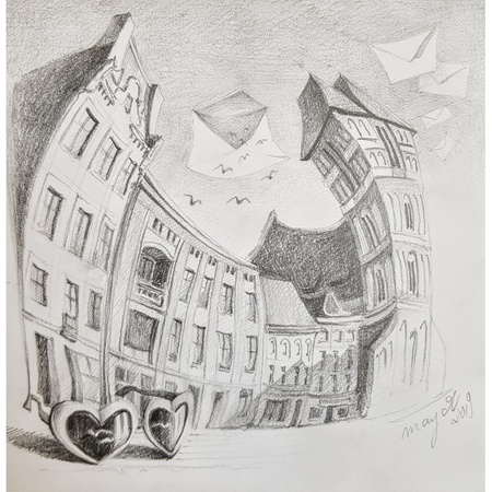 Niepowtarzalny, rysowany na papierze obraz, w magiczny surrealistyczny sposób przedstawia miasto Toruń.