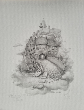 Zachwycająca inkografia na papierze Mai Wolf z serii "Grudziądz", przedstawiająca najpiękniejsze zakątki miasta.