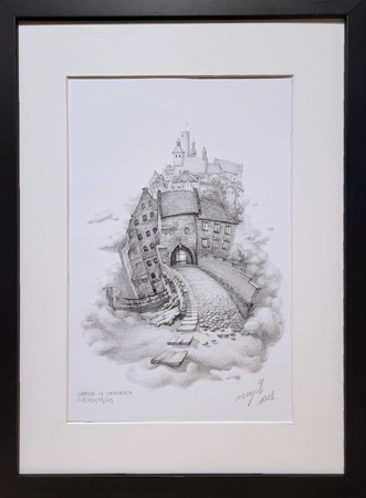Unikalny rysunek Mai Wolf "Spacer w chmurach. Grudziądz" dla prawdziwych wielbicieli sztuki.