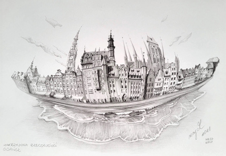 Unikalny rysunek Mai Wolf "Zakrzywiona rzeczywistość. Gdańsk" dla prawdziwych wielbicieli sztuki.